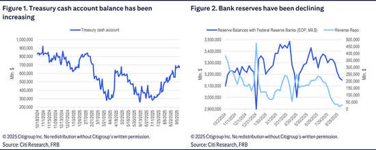 资产负债表负债方面,最主要的变化是流动性从逆回购和银行准备金流向了美国财政部现金账户。截至9月11日,财政部现金账户已增加至约6800亿美元,并有望在未来几周内根据财政部指引进一步增至约8500亿美元。与此同时,逆回购余额(RRP)已降至非常低的水平,约170亿美元,而银行准备金则从今年夏初的约3.4万亿美元下降至3.15万亿美元。