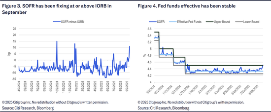值得注意的是,尽管回购市场压力上升,联邦基金有效利率仍然相对稳定。花旗基本预测认为,联邦基金有效利率将保持稳定,但未来几个月相对于逆回购利率可能会略有上升的风险。