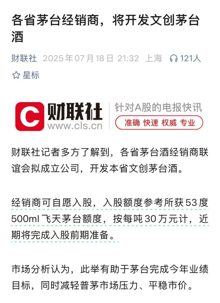 7月,市场消息称各省茅台酒经销商联谊会拟成立公司,开发本省文创茅台酒。经销商可自愿入股,入股额度参考所获53度500ml飞天茅台额度,按每吨30万元计,近期将完成入股前期准备。