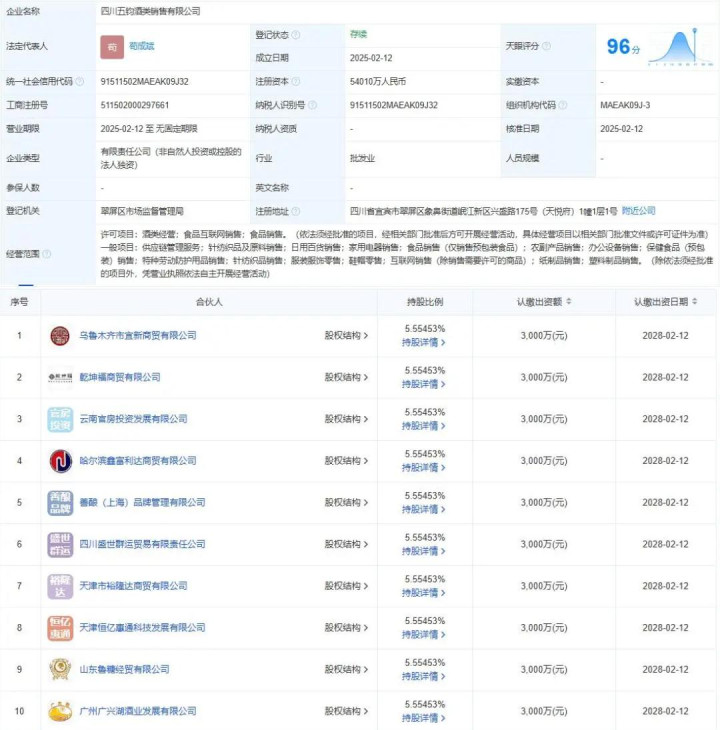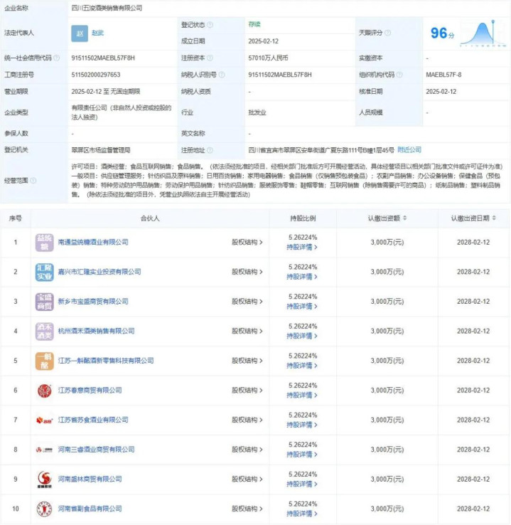 今年2月,四川五钧酒类销售有限公司与四川五浚酒类销售有限公司成立,注册资本分别达5.4亿元和5.7亿元。穿透股权结构可见,这两家公司背后是由39家五粮液核心经销商共同出资组建,其中湖北人人大经贸有限公司、北京乾坤福商贸有限公司、山东泰山名饮有限公司等18家经销商均持有5.55%的均等股份,形成巧妙的股权制衡与决策平衡机制。这种区域联盟与资本穿透相结合的模式,将传统多级分销体系整合为统一服务运营商,从根本上解决价格混乱和渠道内耗问题。